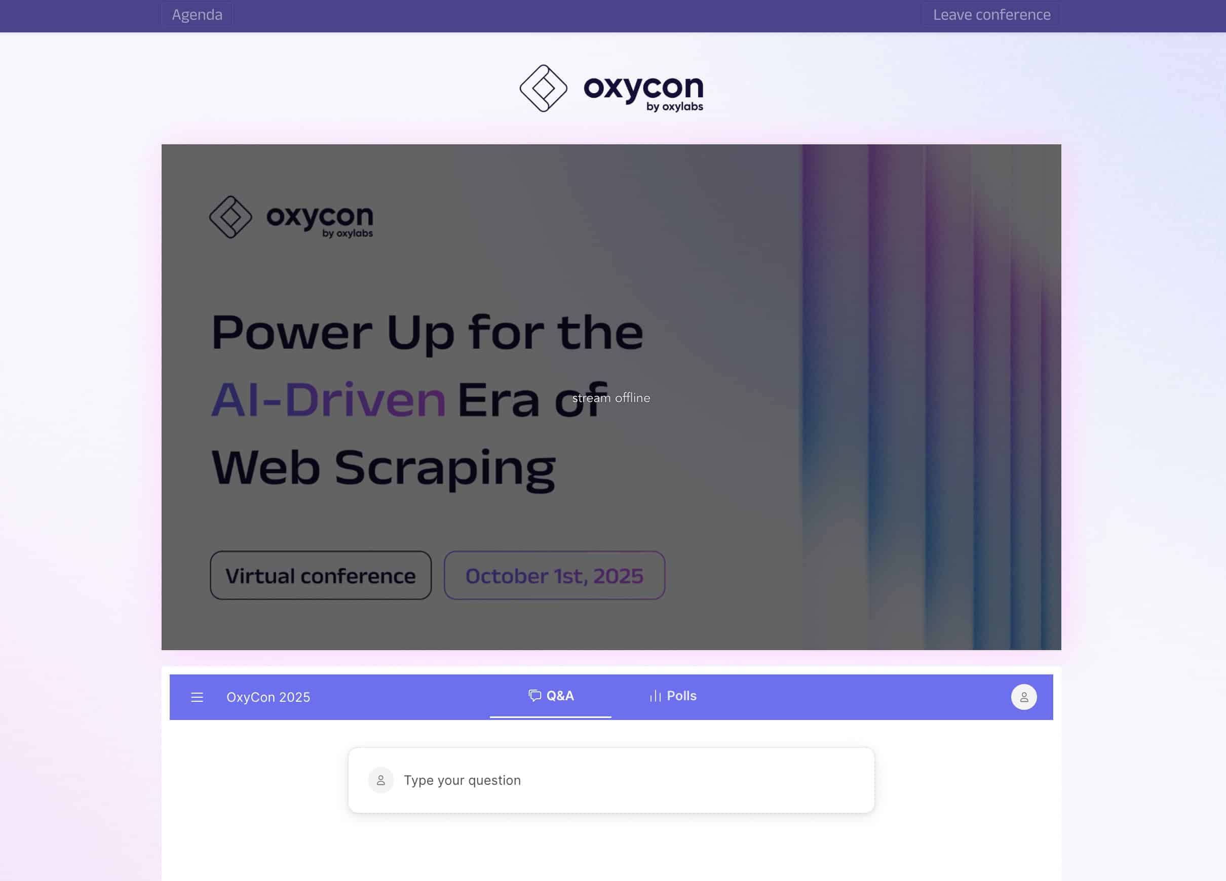 Oxylabs stayed true to its tested formula and made the conference online only. Anyone was free to attend, as long as they registered beforehand. On the day of the event, the organizer sent an email with a link and a code. It led to a lobby that included a video stream, a Slido widget for questions, and the agenda – a very standard affair.