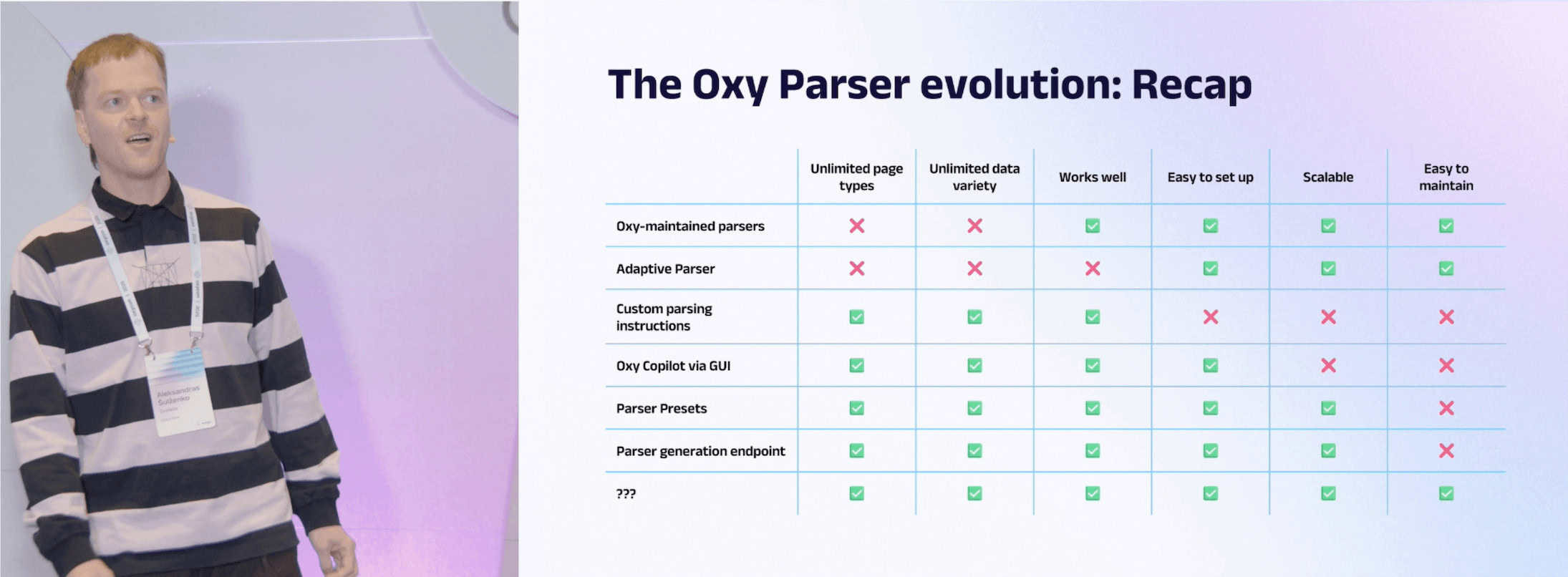 Aleksandras Šulženko, Product Owner at Oxylabs, kicked off the presentations with a walk through history and a feature reveal. He recounted all of his company’s approaches to data parsing, culminating in AI-made parsers that heal themselves.