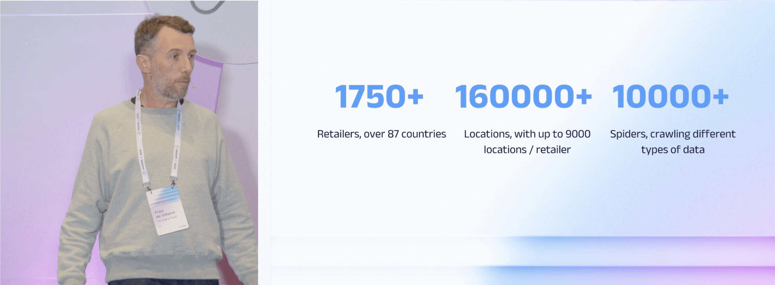 A good one. Fred de Villamil, the self-proclaimed CTO of scale-ups, explained how his company NielsenIQ manages to run over 10,000 precisely geolocated spiders for digital shelf analytics. In a nutshell, Fred’s team helps brands like Walmart to understand how their stores perform online.