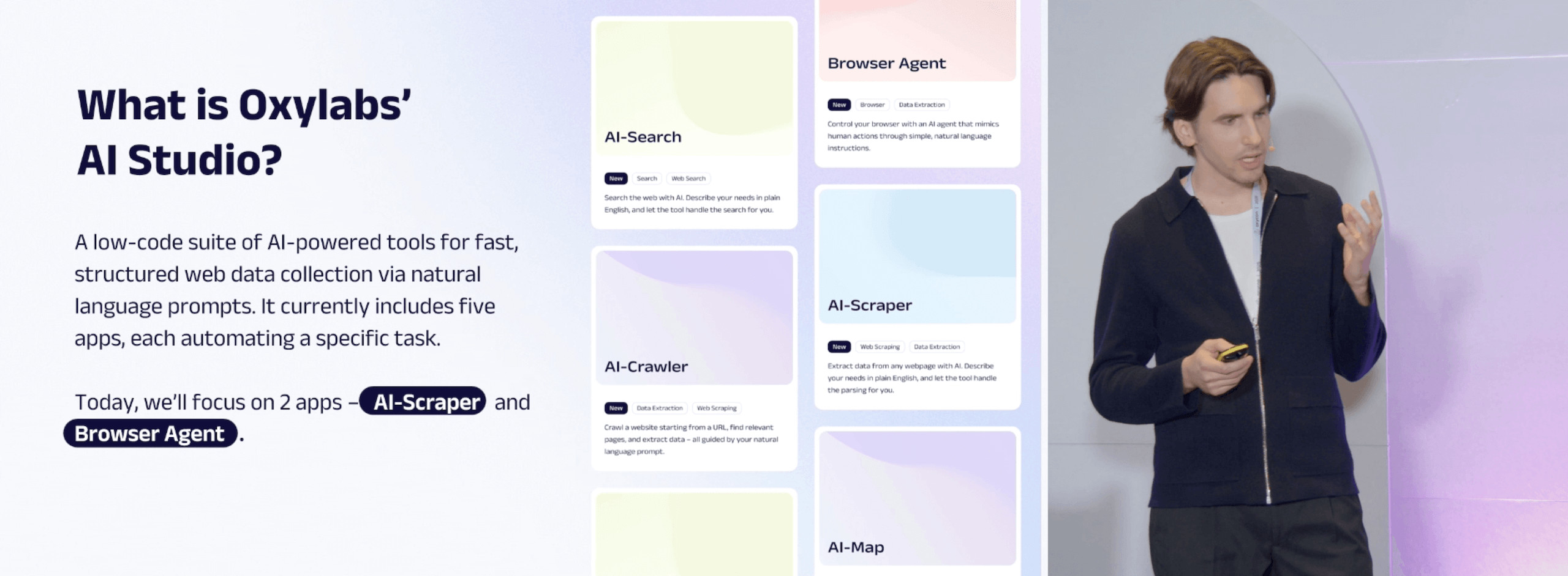 Another product demonstration. This time, Oxylabs’ Head of Data Rytis Ulys took the wheel to showcase his company’s new AI Studio. It includes endpoints for scraping and crawling websites, searching Google, and controlling cloud browsers – they’re meant for AI startups and bear a strong resemblance to Firecrawl.