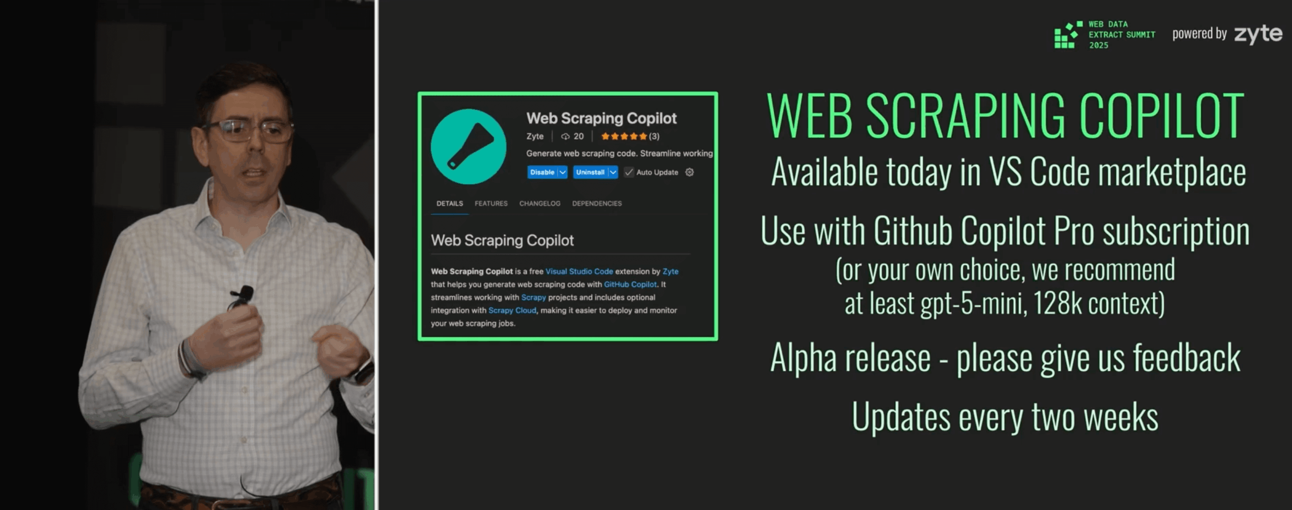 Without beating around the bush, it’s a VS Code extension called Web Scraping Copilot. The tool’s main purpose is to help developers build Scrapy spiders faster by writing objects, fixtures, and other code needed to scrape websites. It achieves this by coupling GitHub’s Copilot and Zyte’s MCP server.