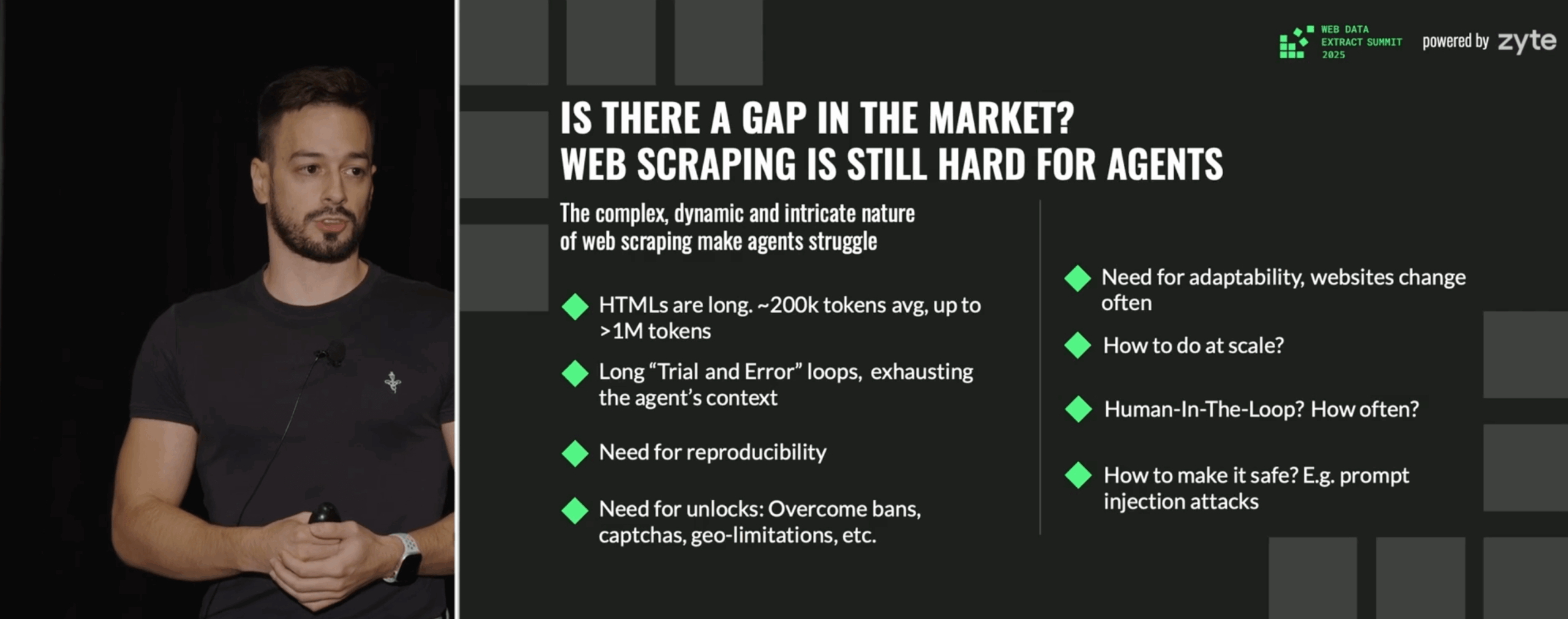 The first part covered various types of AI agents, drumming up hype with quotes about their adoption. Ian then took viewers back to reality: in their current shape, AI agents kind of suck for web scraping. He gave three slides with challenges and potential solutions before introducing Zyte’s attempt at overcoming the shortcomings.
