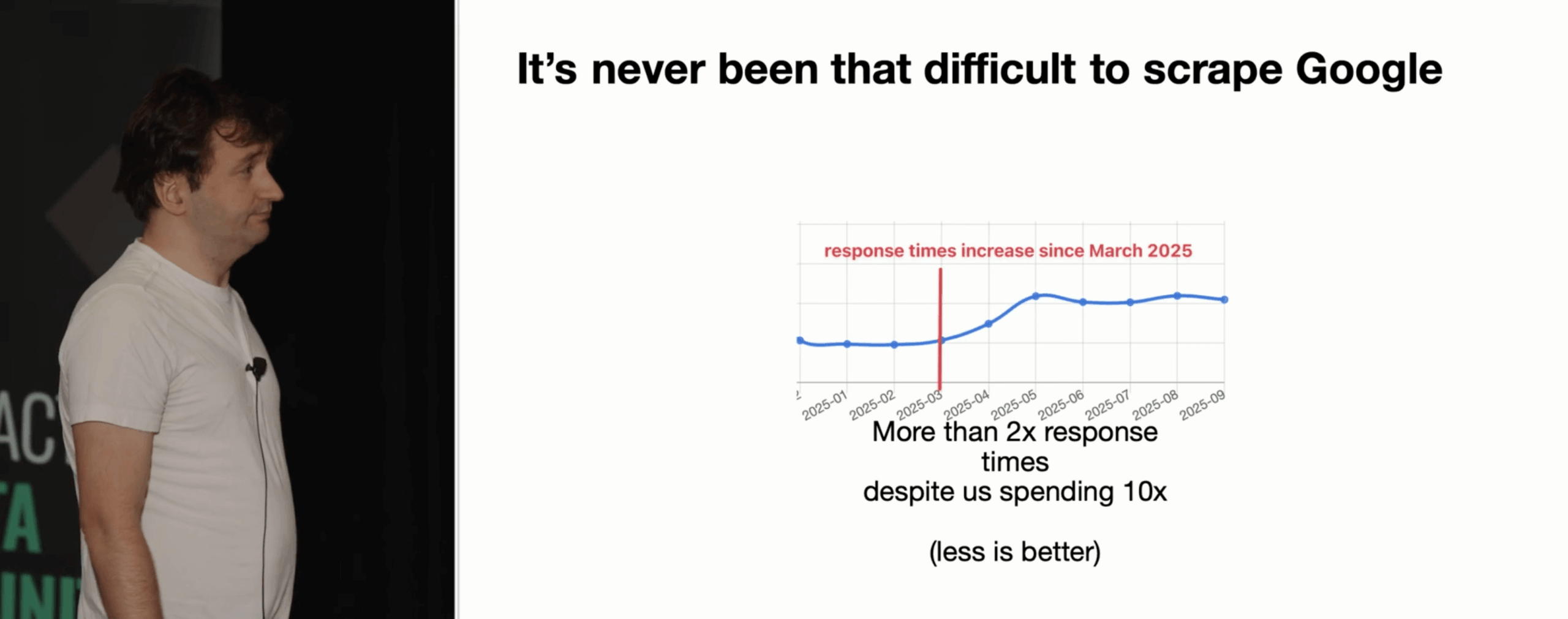 In the third talk Julien Khaleghy, CEO of a major SERP API called… SerpApi, shared the trials and tribulations of scraping Google data in 2025. The takeaway is that despite spending ten times the resources, Google is now twice slower to scrape. Ouch.