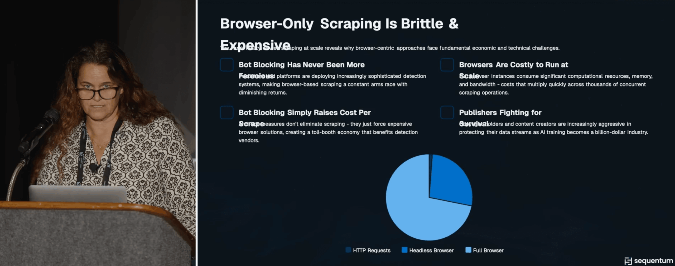 Another contrarian presentation – but this time, without a twist. Sarah McKenna from Sequentum, a serial presenter at Zyte’s events, challenged the prevailing tendency to run everything through a web browser.