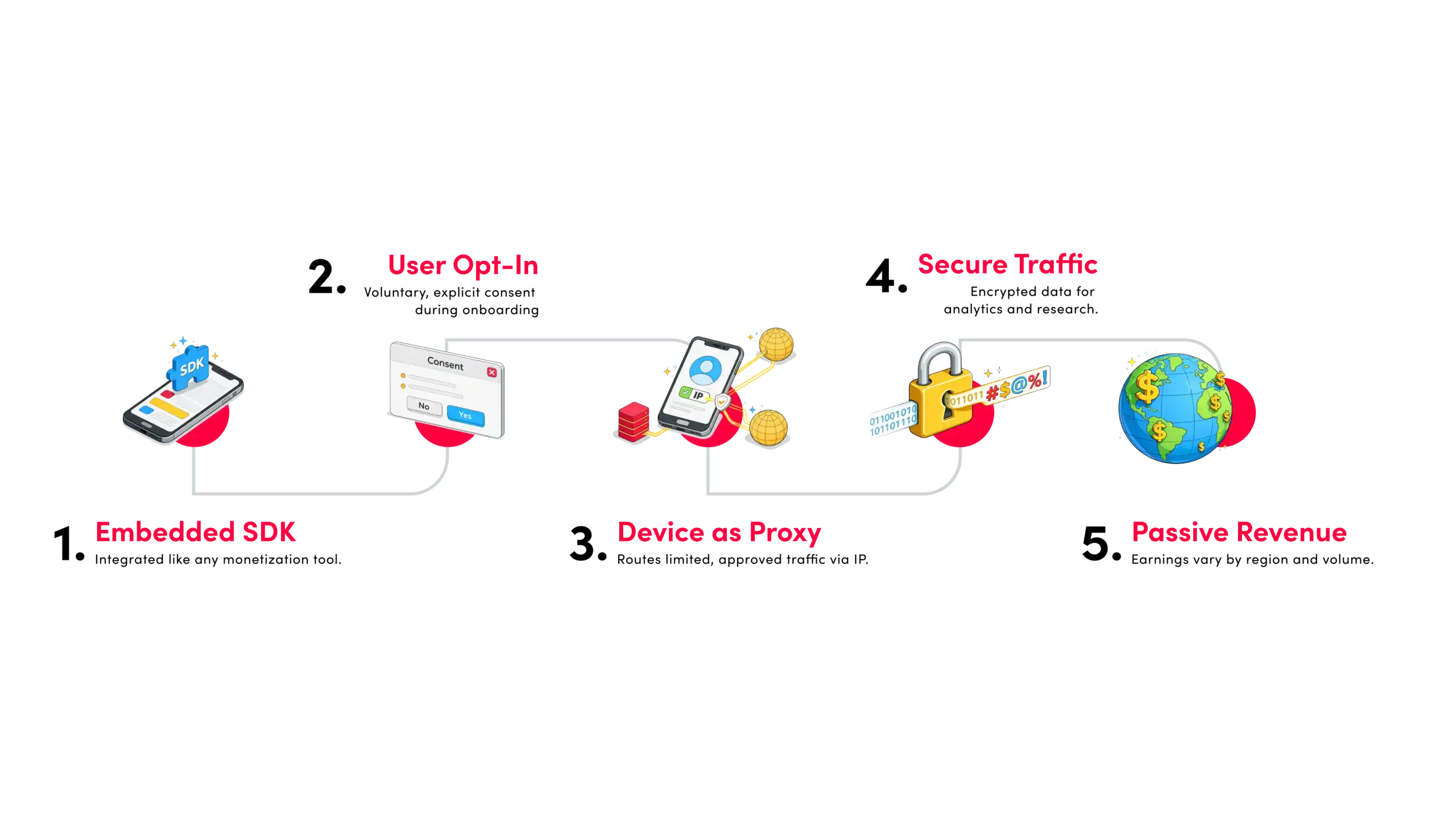 Meanwhile, internet sharing SDKs entered the game by making it possible to earn from the 95% who never hit “buy” – not by converting them, but by letting their devices do the contributing. The opt-in model preserves user choice but broadens the revenue base beyond power users.