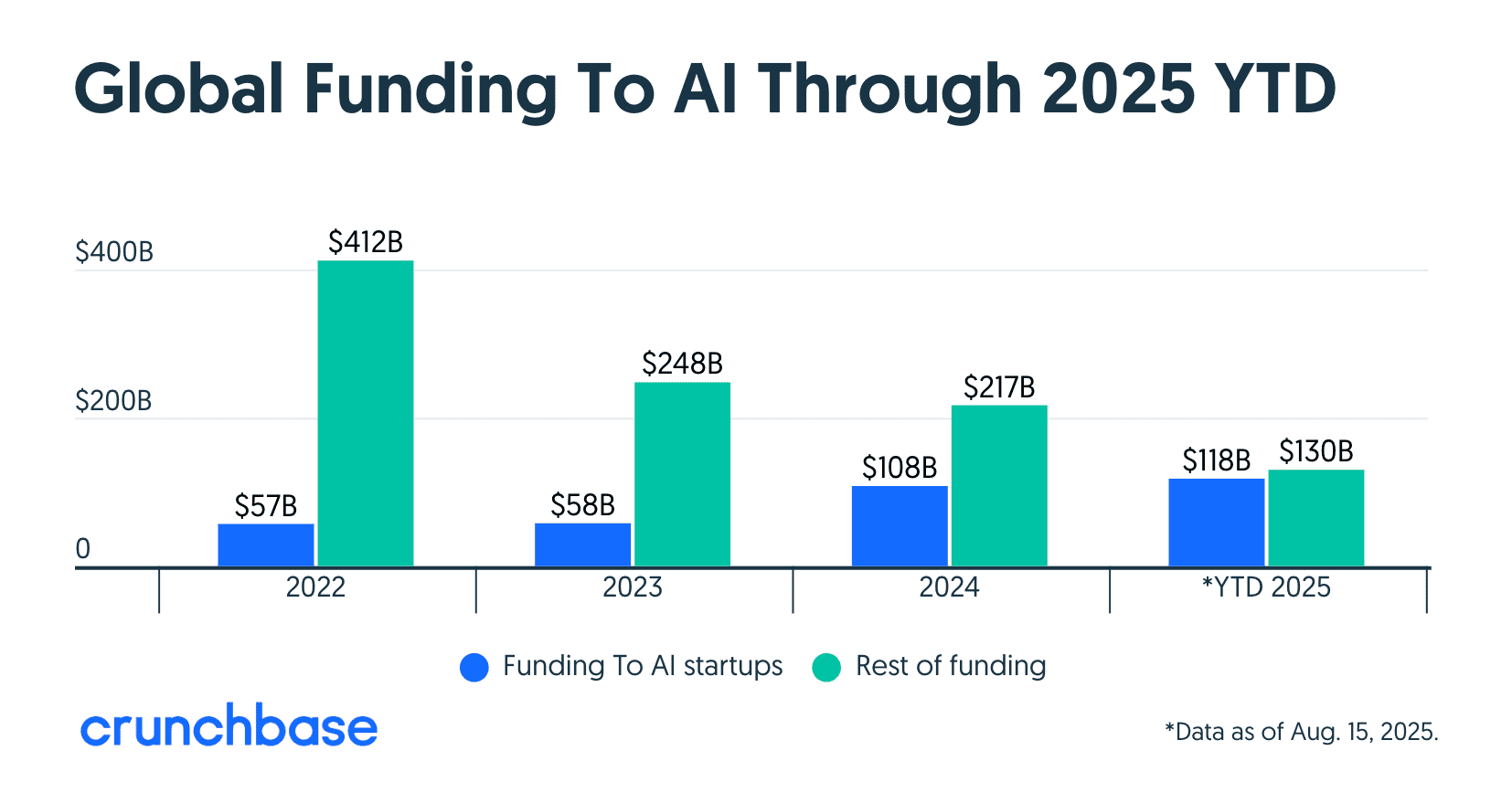 How do you quantify hype? It’s simple: just follow the flow of venture capital. In this case, the numbers are more than obvious: in 2024, AI startups received twice as much funding than the year before; by August 2025, they had already raised more than in 2024 as a whole. Out of total VC investments this year, AI had raked nearly a half of the pie, compared to just one third the year before.