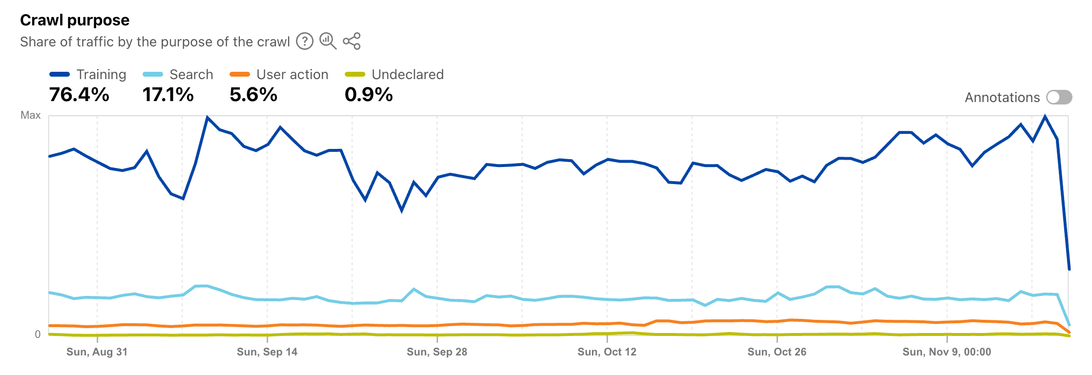 - Despite the narrative shifting to AI agents, LLM training continues to generate the bulk of web traffic, now focusing on multimodal data.