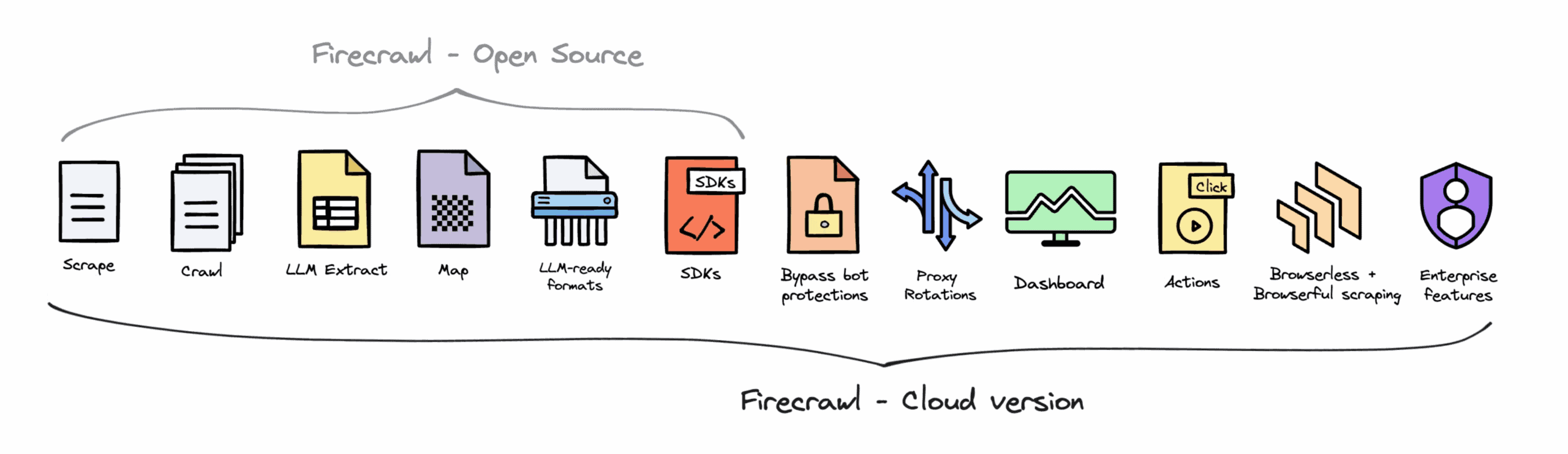 | Firecrawl | Crawling, scraping & data parsing | 60K | AGPL-3 |