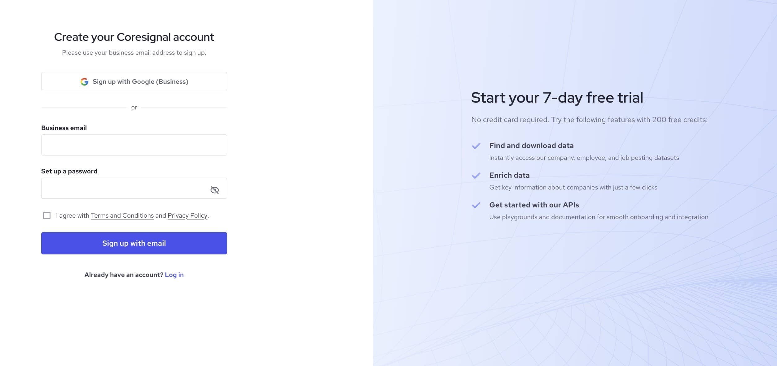Let’s see what it’s like to use Coresignal. We’ll go through its registration process, dashboard, documentation, and customer service.