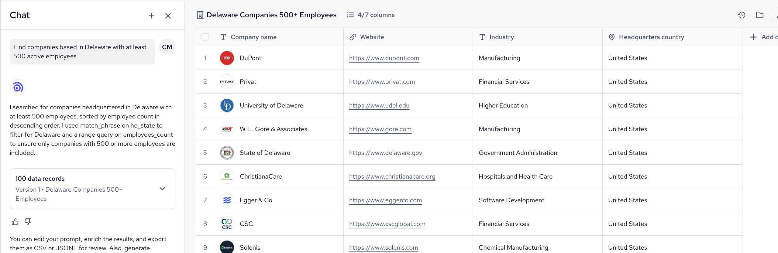 Then, the tool generates a B2B list with the top results. You can edit this list, enrich it, and add more filters. This allows you to download up to 100 data records in JSONL or CSV format.