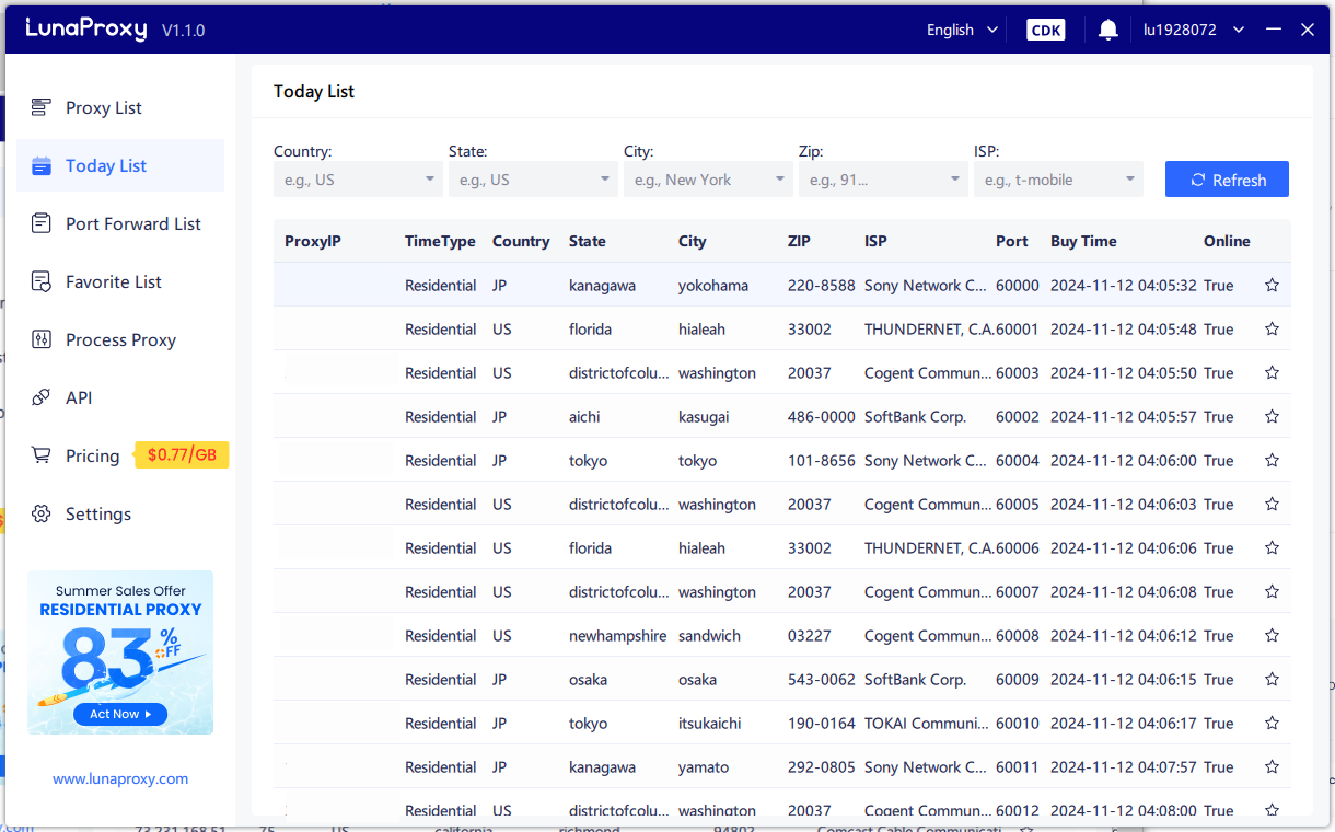 When using whitelisted IP authentication, the better way to set up LunaProxy’s residential proxies is through a separate dashboard tool called proxy manager (don’t confuse it with the desktop app). It removes the widget’s limitations of only country-level targeting and fixed session duration. It also lets you rotate proxies at will.