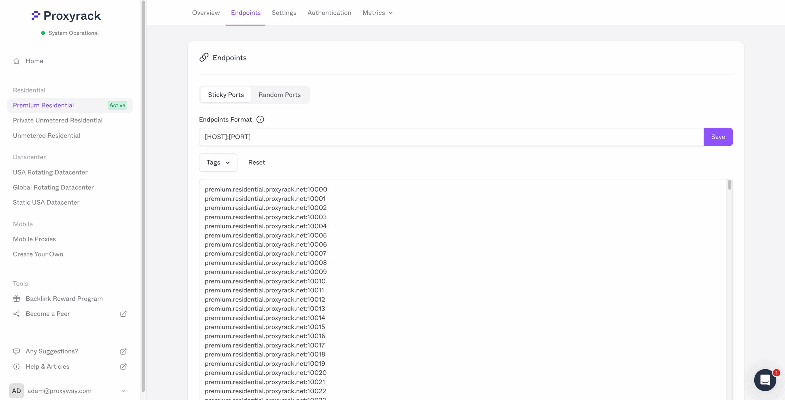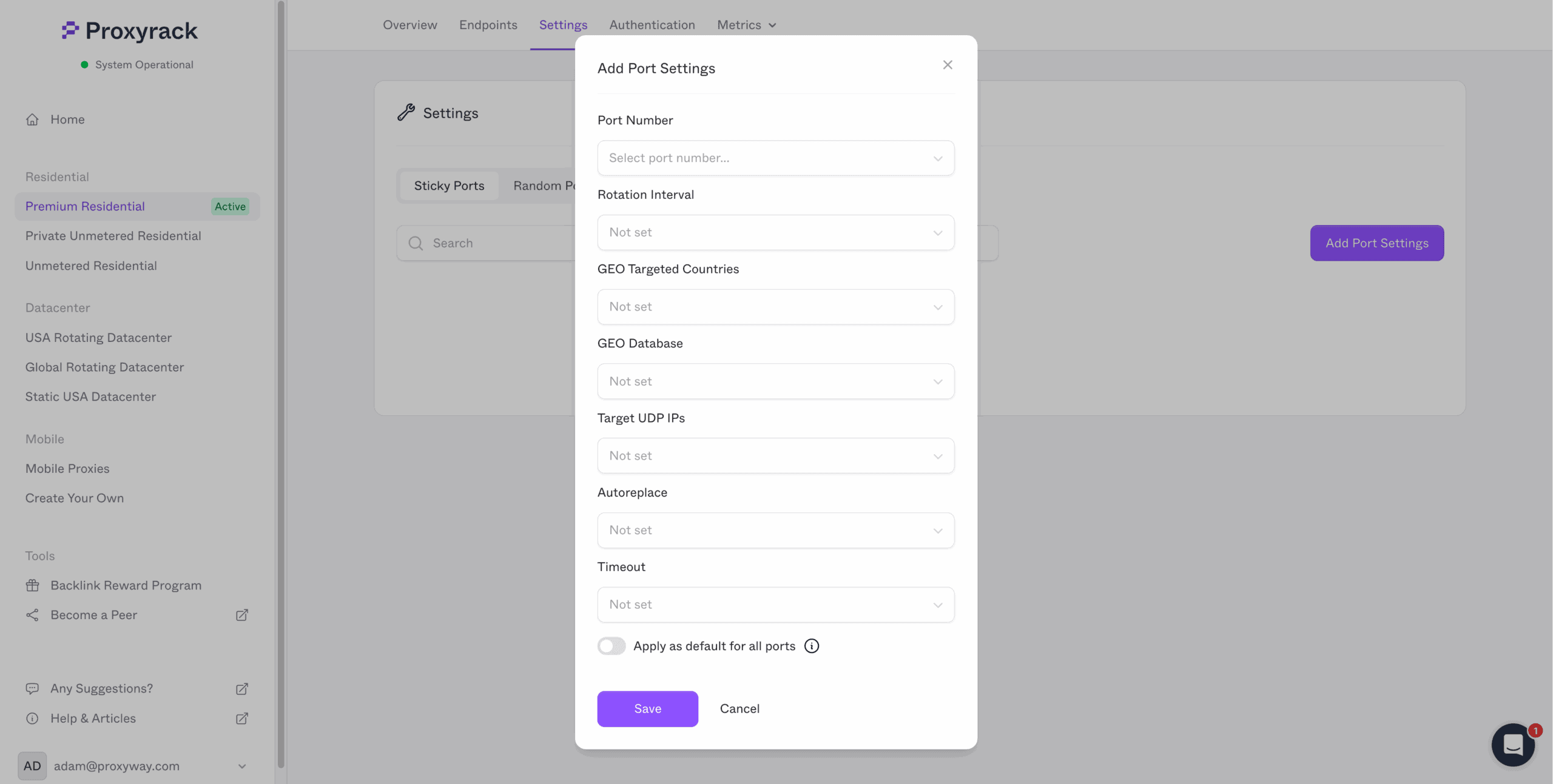 Otherwise, Proxyrack gives you two ways to set up proxy servers. One involves going to the dashboard and mapping your preferred settings (location, rotation, etc) to different ports. It’s not always convenient, as you have to either configure each port one by one, or apply the settings universally.