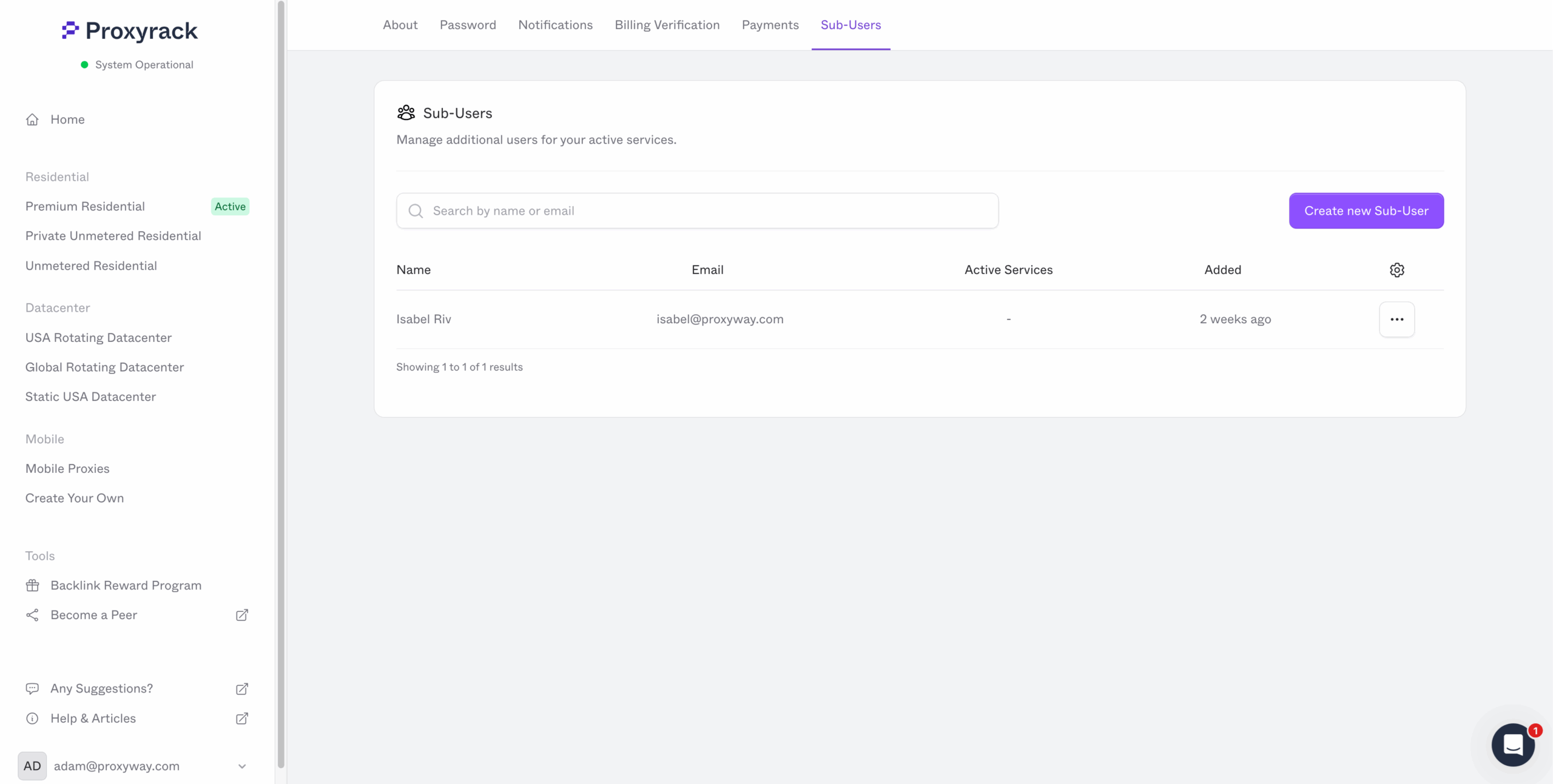 Proxyrack lacks two-factor authentication or an event log, but it does have sub-users. The provider handles this feature in a way we haven’t encountered elsewhere.
