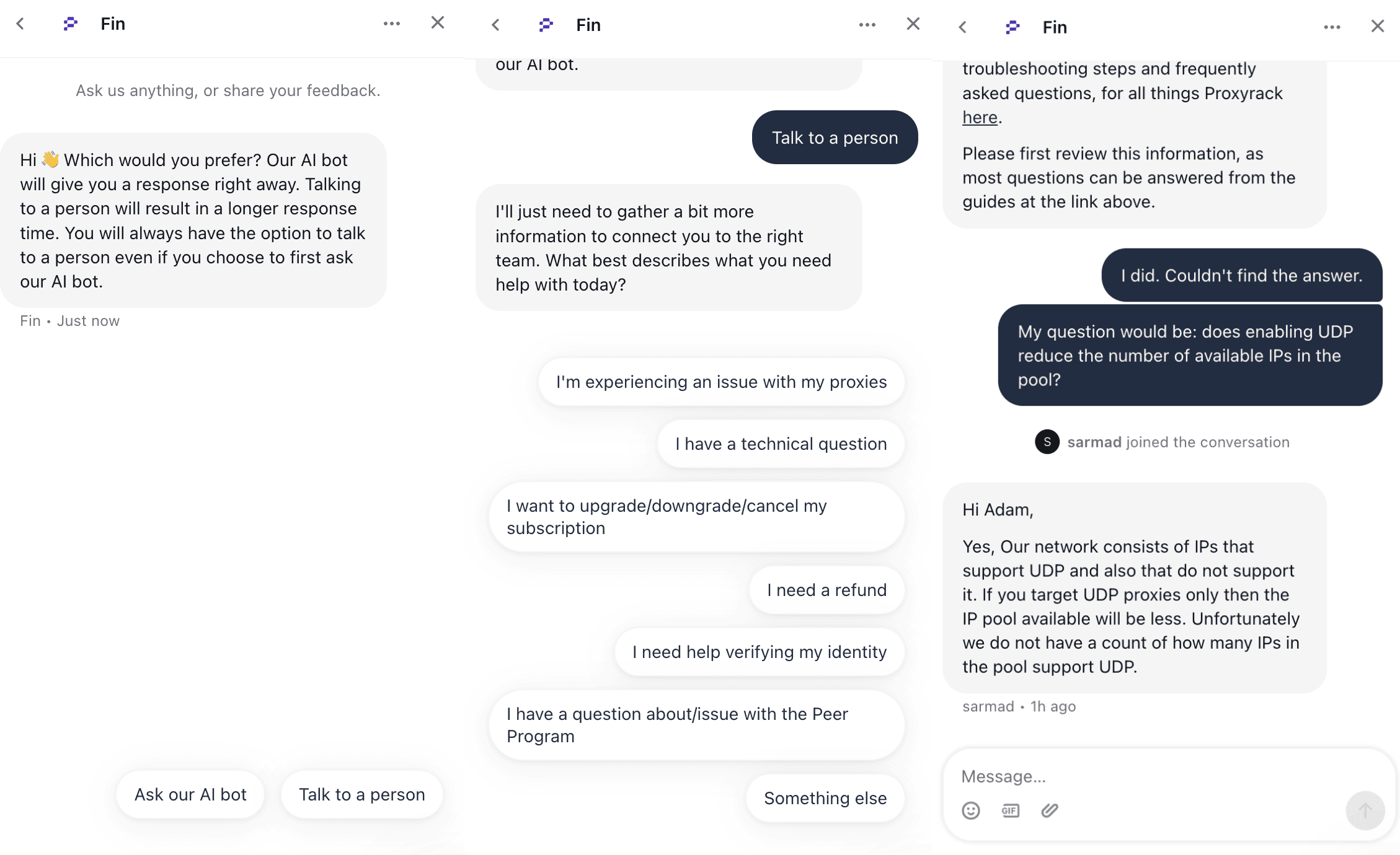 Proxyrack uses Intercom, so it integrates with the help docs, sends email notifications, and allows exporting the conversation.