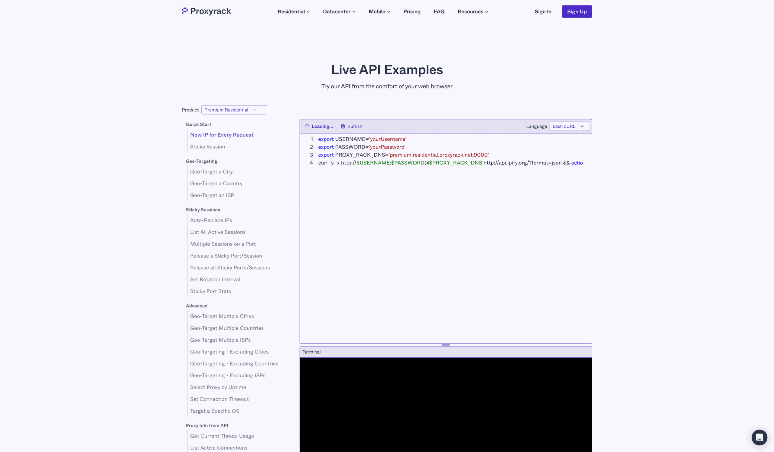 The second uses Proxyrack’s API. Basically, you can choose from different scenarios (like targeting a city), and the API tool creates code samples in multiple programming languages. It’s supposed to import credentials automatically, but for some reason, they failed to load for us.