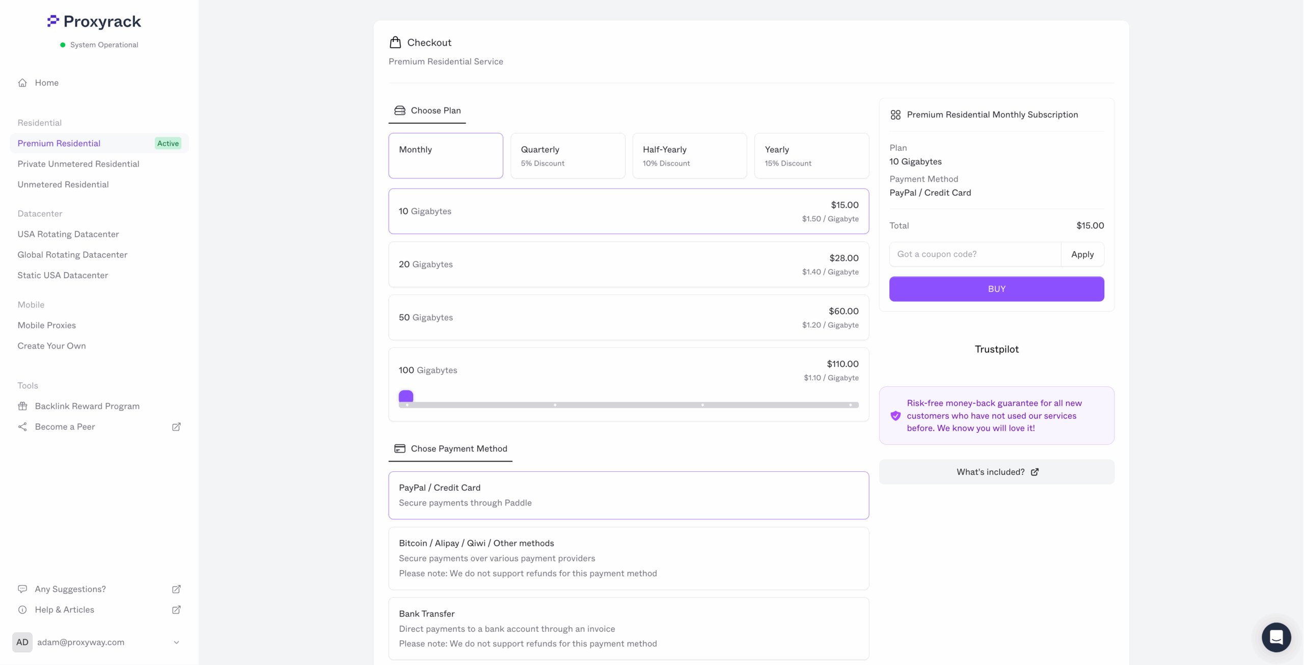 Proxyrack’s dashboard lacks wallet functionality, so you’ll need to make separate transactions for every purchase. There are three payment methods to choose from. Keep in mind that only one is refundable; so if you’re using a local payment provider or Bitcoin, you’ll be out of luck.