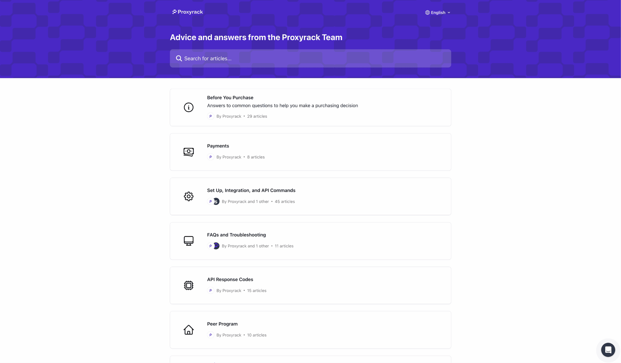 Proxyrack’s documentation hub is organized as a knowledge base. It’s divided into various sections like general proxy information, API parameters, payments, response codes, and more.